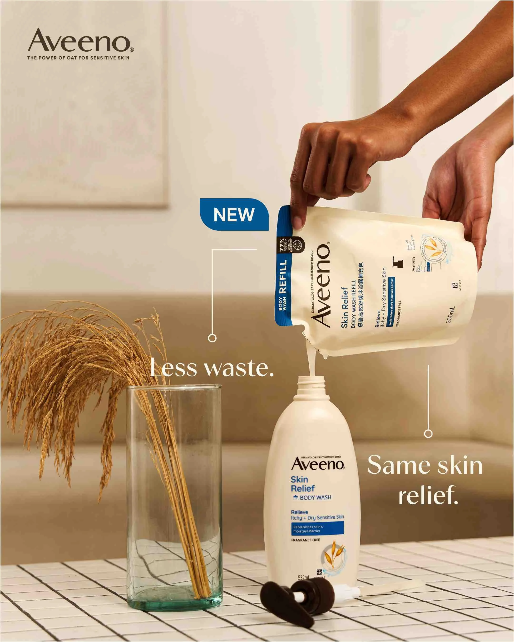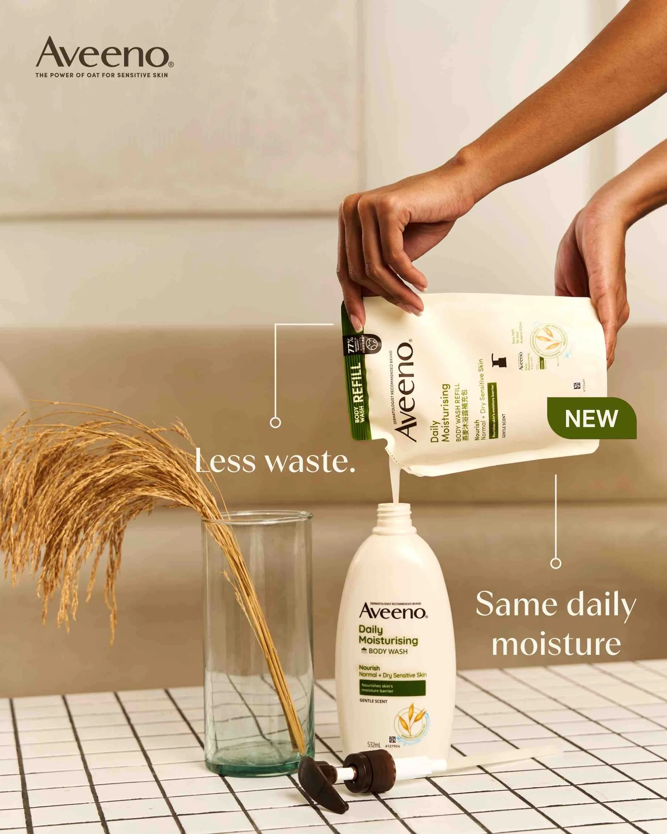 In the sensitive skin community, Aveeno is number one through its science-backed products and thoughtful innovations designed for daily care. With Aveeno Body Wash Refills, Aveeno proves that it will always continue to seek solutions for sensitive skin that will give confidence to be the best for our planet.