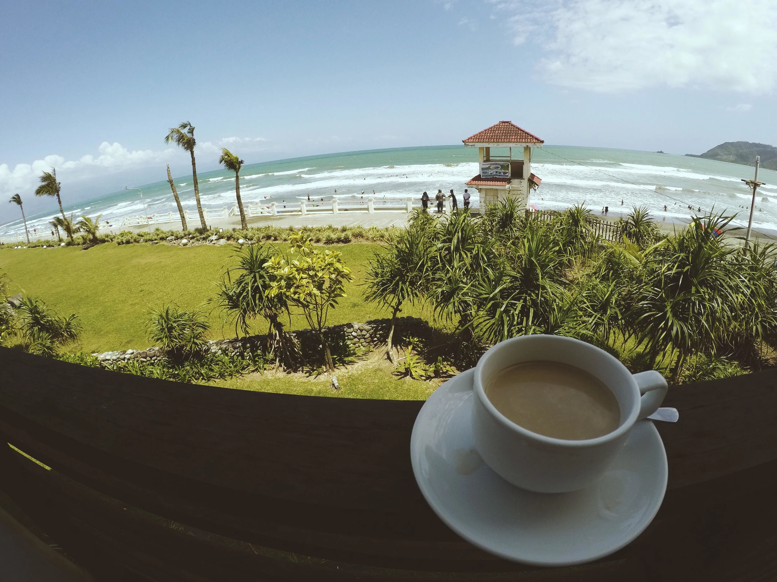 We stayed at Costa Pacifica. Here's me having a cup of brewed coffee by the beach.