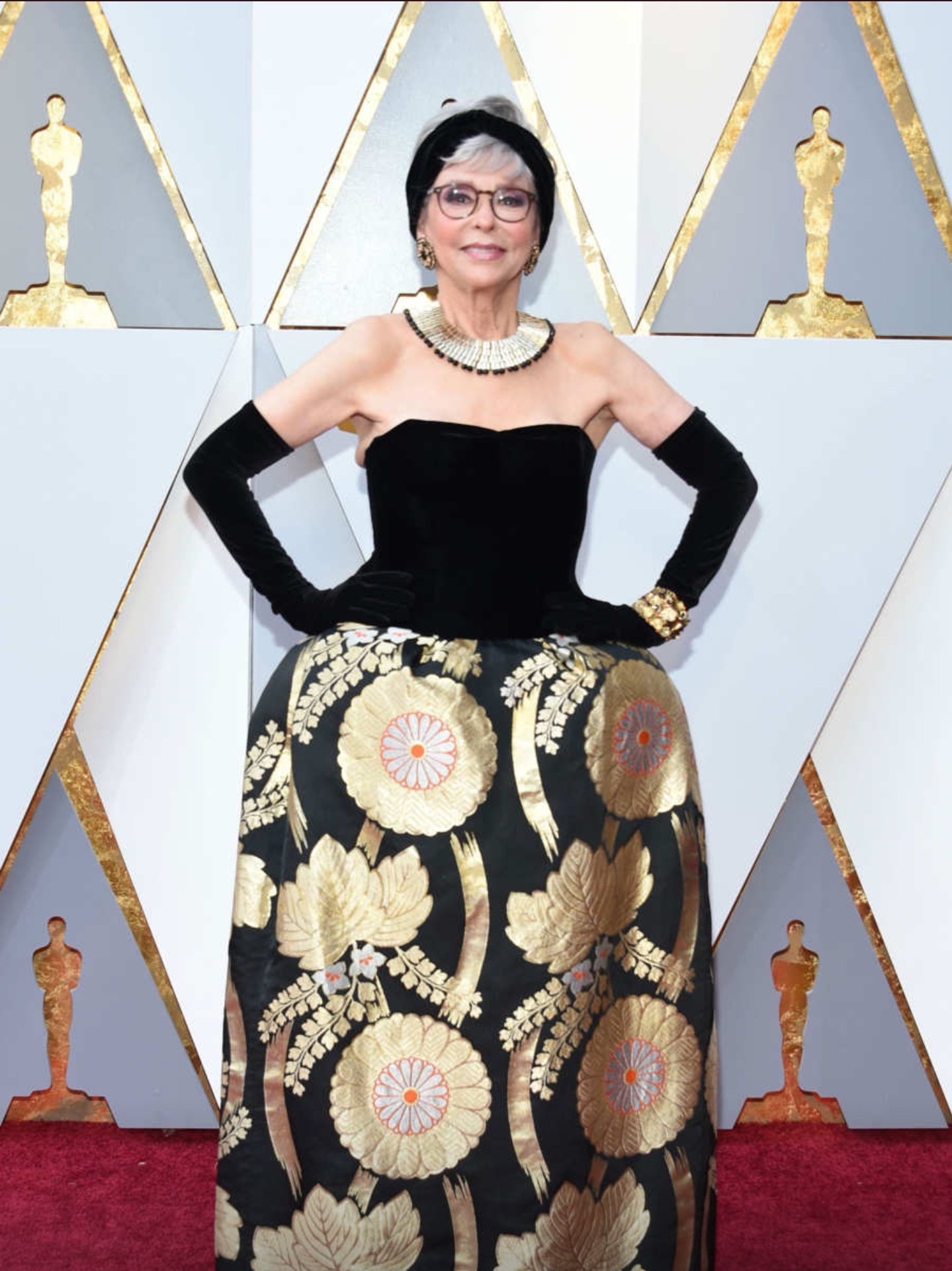 When Rita Moreno walked the red carpet for 90th Academy Awards, she was wearing the same gown. Moreno told E!'s Ryan Seacrest that the skirt was made from a material traditionally used to make Japanese kimonos.
